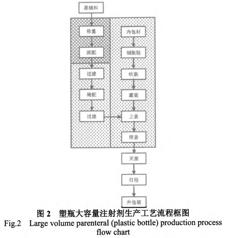 大輸液的生產(chǎn)過程主要包括原輔料的準(zhǔn)備、稱量、濃配、稀配、灌封、滅菌、燈檢、外包裝等工序。圖1、2、3分別為軟袋大輸液的生產(chǎn)工藝流程框圖、塑瓶大輸液的生產(chǎn)工藝流程框圖以及玻瓶大輸液的生產(chǎn)工藝流程框圖。