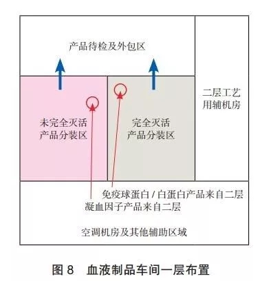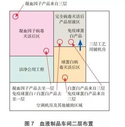 布置中,不僅將血液制品的病毒滅活前后工藝生產區單獨設置,并且將病毒滅活工藝前工藝區與病毒滅活后工藝區分別整合在上下兩個樓層里面。首先從區域管理上,2個區域更加地相互獨立,人員與物流管理上更加簡單。其次,每個產品的病毒滅活前后工藝生產區域上下基本一一對應,未完全病毒滅活后產品分裝區與凝血因子病毒滅活后區上下對應,完全病毒滅活后產品分裝區與完全病毒滅活后產品原液區上下對應。
